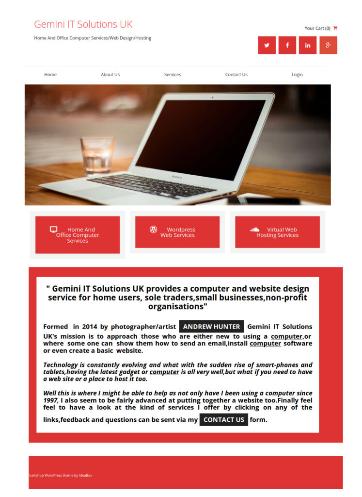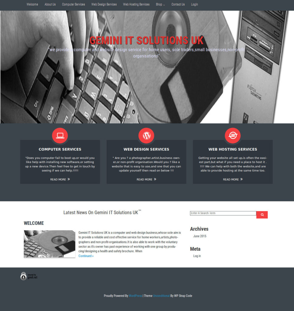 Gemini IT Solutions was purely created to see if could put my skills and knowledge of what you see above into some kind of profitable business by building and designing websites using Site-Origin and WordPress, followed by helping people with their computer and IT issues. Due to long term disability health problems, I have been declared as not looking for employment, so the best way forward is for me to continue in what I tried to do with Gemini IT Solutions is to provide some kind of service in the way of computer/IT support and web design on a not for profit basis which will help with the running costs of my websites and hosting.